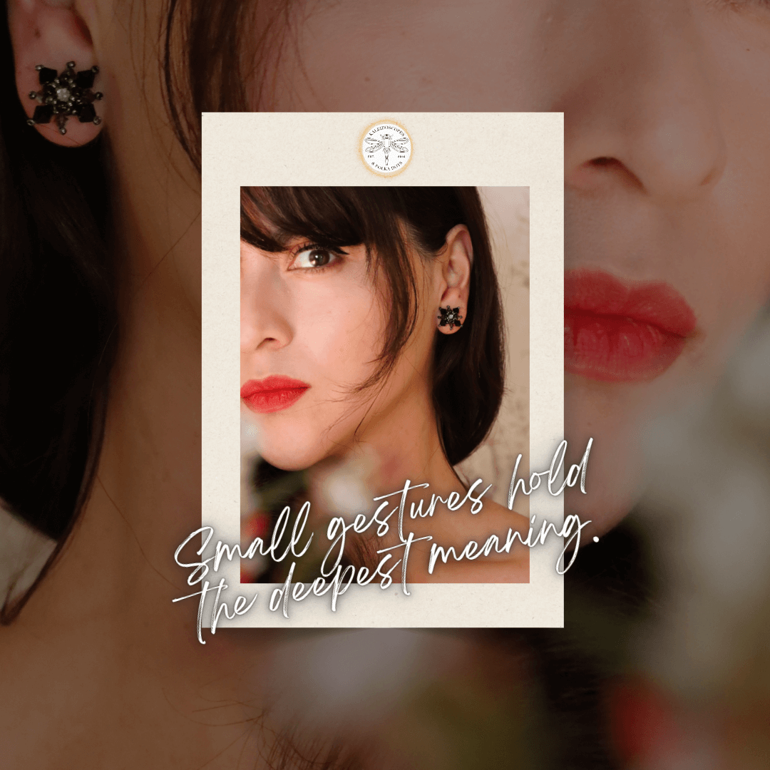 Inspired by midnight blooms and whispered prayers, these timeless vintage-inspired earrings combine black and silver accents and rose-hued crystals with delicate beadwork.